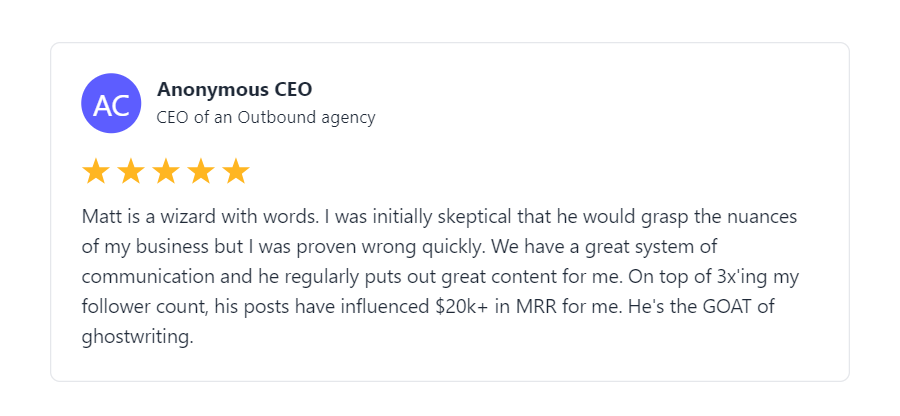 I've written over 10,000 pieces of social media content for my own multi-6-figure business and 7 figure CEOs and Founders. My copywriting system has helped business owners make up to $50k/month extra: